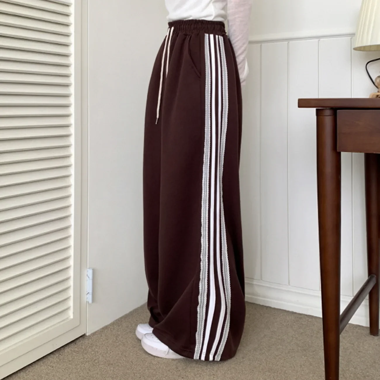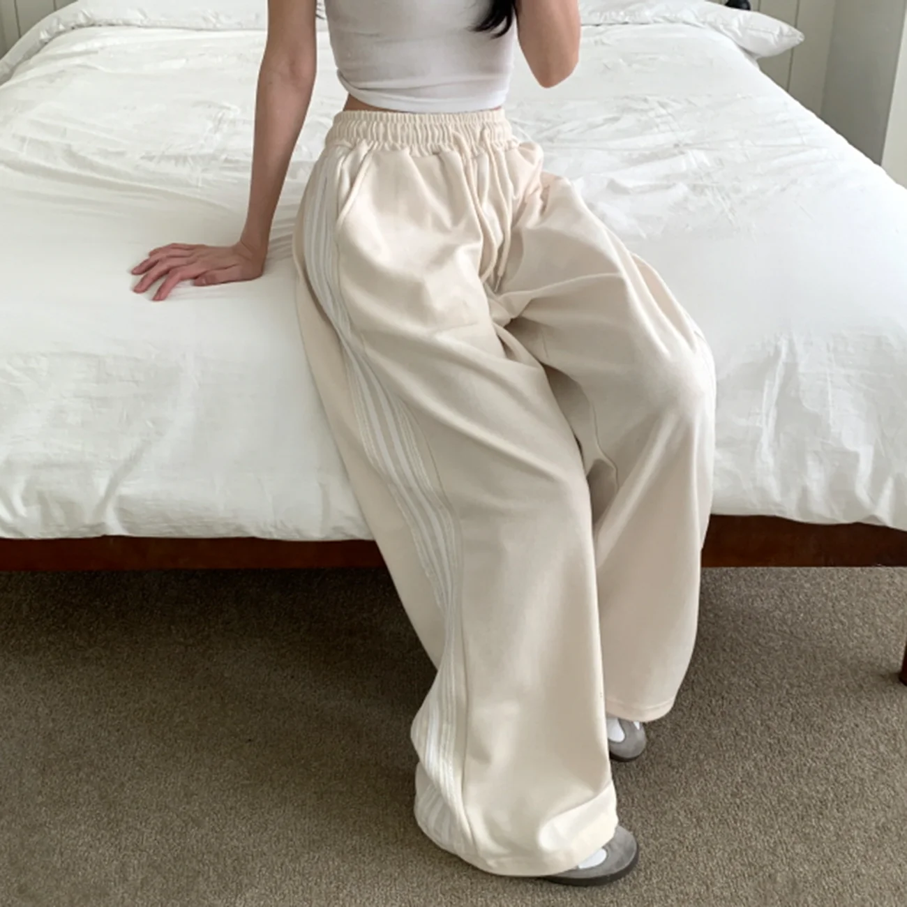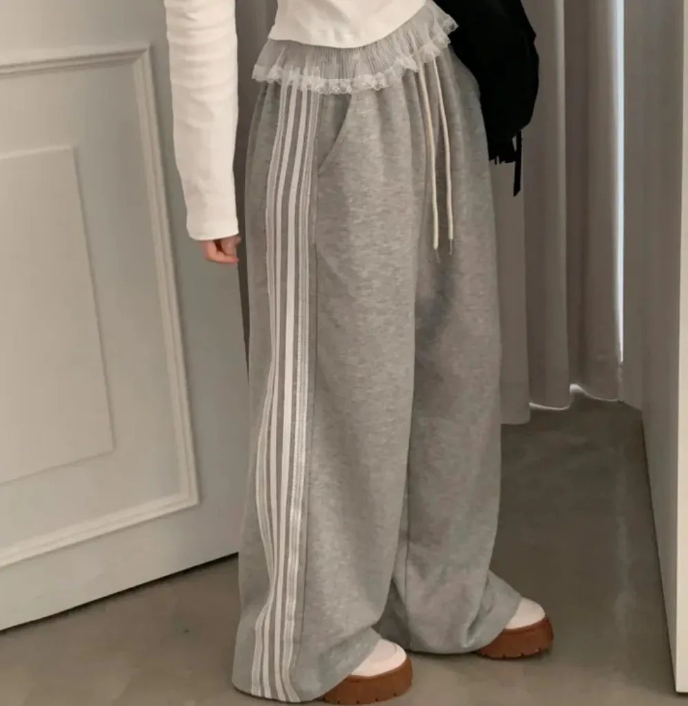 RR Sporty Loose Wide Leg Sweatpants Women Elegant Side Lace Patchwork Trousers Women Drawstring Pants Female Ladies